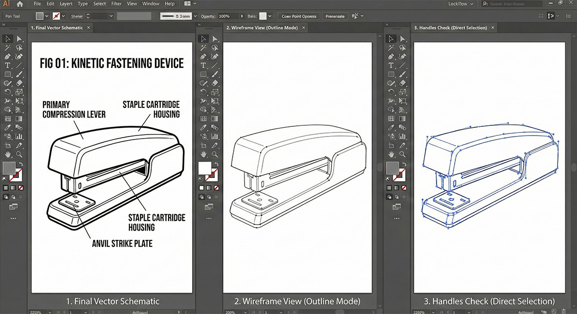 - The "Handles" Check: A screenshot with the Direct Selection Tool (White Arrow) selecting the main curves, showing the handles of the Bézier curves.